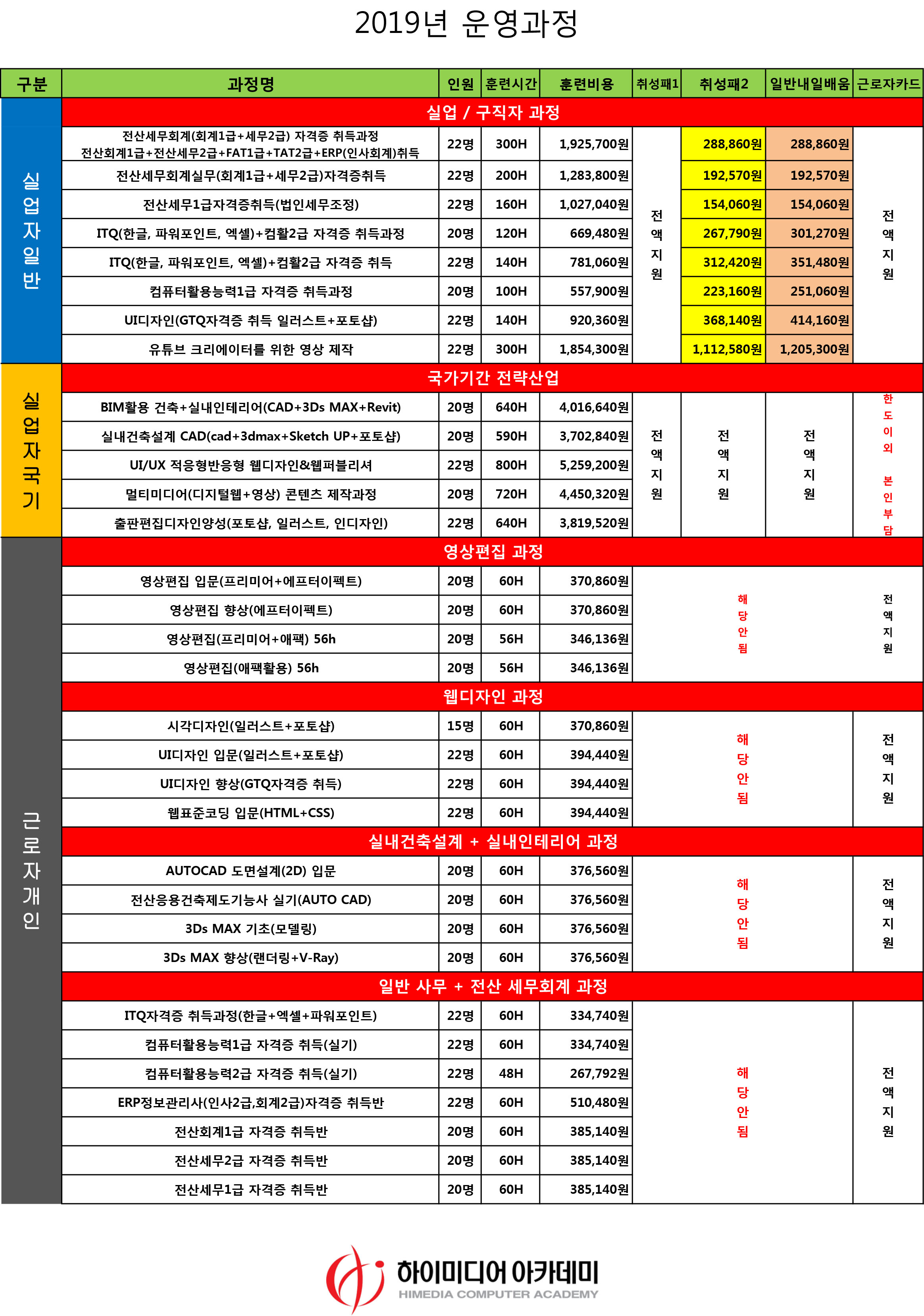 천호 캠퍼스 [2019년] 천호 하이미디어아카데미 컴퓨터학원 수강료 안내 Post. 2019.03.19 [2019년] 천호 하이미디어아카데미 컴퓨터학원 수강료 안내 ■ 실업자 근로자 내일배움카드 국비지원 실업자 전산세무회계 분야 취업률 우수기관 ( 본인부담금 : 0% ~ 15%) 웹디자인 /캐드/ 3D맥스/ 인테리어/ 포토샵/ 일러스트/ UI디자인/ 편집디자인/ 영상편집/ 프리미어/ 에프터이펙트/ 모션그래픽/ 컴퓨터활용능력1급/ 2급 / 전산회계/ 전산세무/ AT/ TAT/ ERP 인사,회계