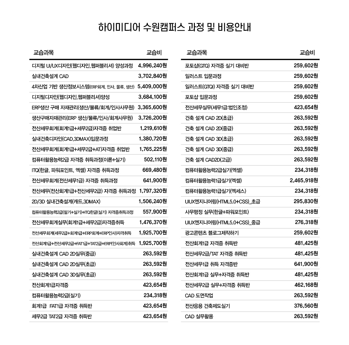 2019 수원캠퍼스 교습비게시표