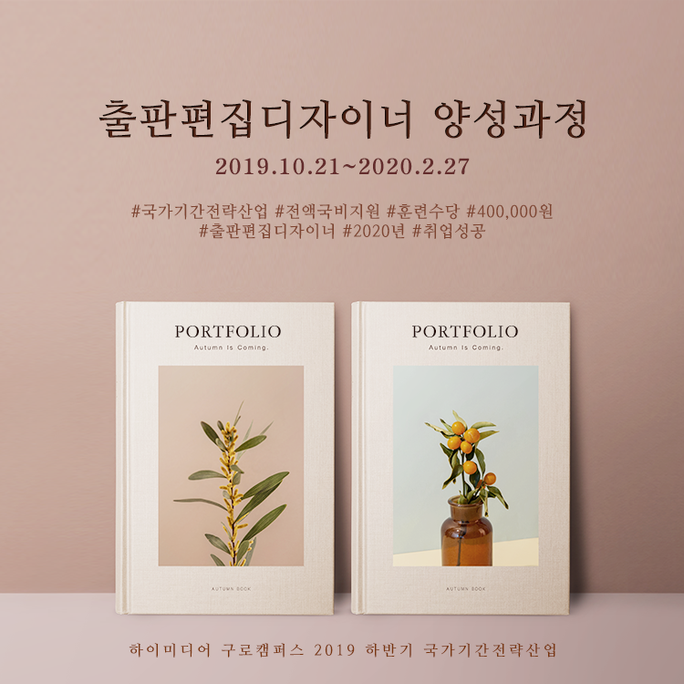 구로 캠퍼스 출판편집디자인취업과정 국비전액 수강생 모집 (2019.10.21일개강) Post. 2019.09.03 하이미디어컴퓨터학원 구로캠퍼스2019년 하반기 출판편집디자이너양성과정 기간: 2019.10.21~2020.02.27시간: 09:30~18:30 (월~금)수강료: 4,296,960원국비지원: 100%지원 (훈련수당 매월 최대 400,000원) 교육상담문의: 02-3667-0008